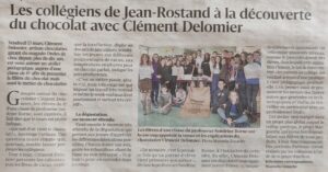 Belle rencontre ce vendredi 13 mars lorsque les élèves de 6E ont eu la chance de s’entendre conter l’aventure du chocolat, depuis la cabosse renfermant les fèves de cacao, accrochée à son cacaoyer des pays proches de l’Équateur (qu’il a fallu savoir où localiser sur la carte !), jusqu’à la création des multiples gourmandises qui prennent naissance entre les mains de l’artisan chocolatier.